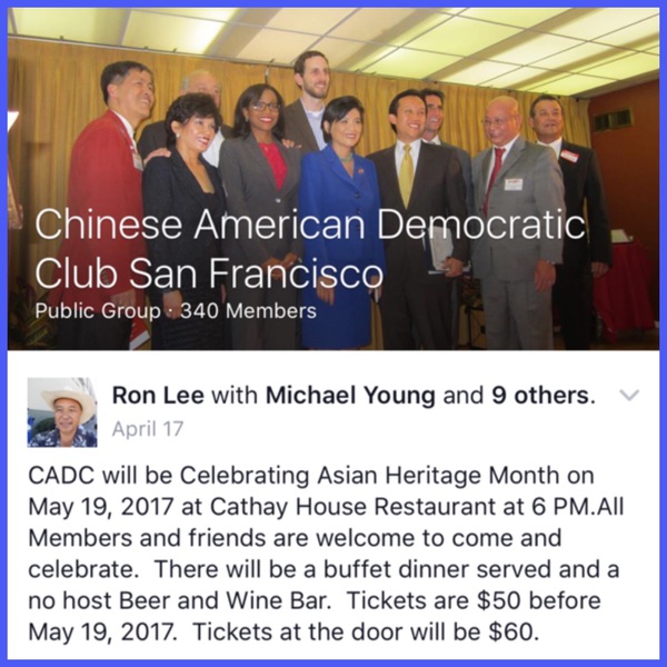 「三藩市华裔民主党餐酒会」星期五5/19晚上6pm,衣香鬓影,冠盖云集。这是政界人士来与大家见面的机会,就是因为华裔民主党俱乐部的面子!这个俱乐部有60年历史,美国第一个为华人争取权益、反歧视的团体。当晚的buffet自助餐、酒水、俊男美女,吃的是场面,活的是生息,说不准能像往年那样见到市长、市参事和各等官员,自拍合拍的良机🤳。您不需要是任何党派,来玩就是。地点:华埠华园酒家,Cathay House ,718 California Street