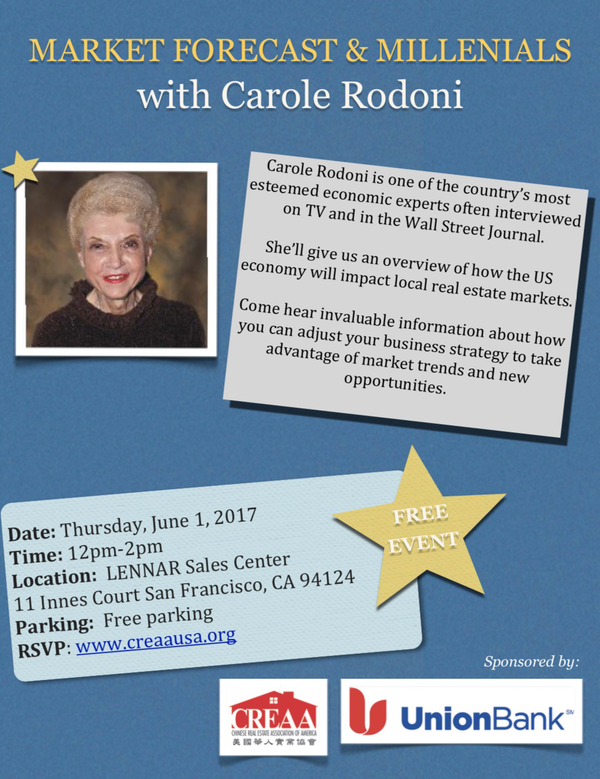 「地产市场预测」6/1星期四中午12点,有工作午餐。免费。来听听资深专家讨论千禧代高科技年轻人的习性/::P,和他们对市场的影响。买还是卖?租还是放?这两年的走势如何?怎样预备各种的可能性?地点:著名的Lennar楼盘样出售中心(看看也好)11 Innes Court, 94124. 免费停车场