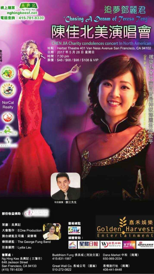 「陈佳北美演唱会」下星期五5/28晚上7:30pm,我和闺蜜们已经买好票,等待这个 “追梦邓丽君” 的实力歌手。陈佳与邓丽君,不但样子似、神似,而且是科班出身的实力歌手,样子甜美不需造作。这个比较令我折服。闺蜜们来享受一下吧。跟 “领导” 说,这还是母亲节的月份,让他大开绿灯。(或者带上领导一起来吧)。售票地点:味国点心,2034 Irving Street, 1-415-812-8188。演出地点:Herbst Theater,401 Van Ness Ave., SF