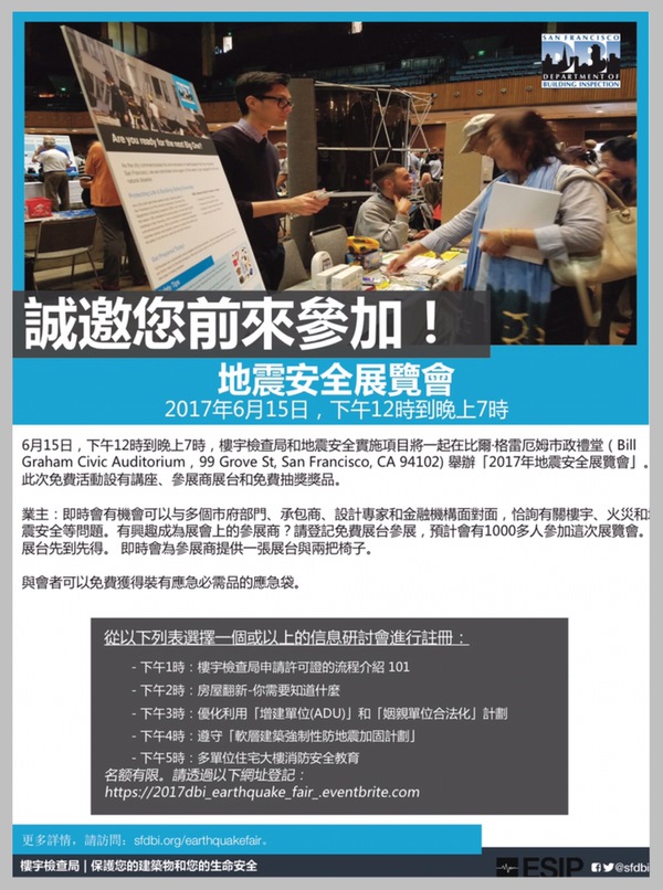 「DBI地震及楼宇安全展览会」6月15日12pm-7pm。凡是有物业的,特别是三层楼或五个单位以上的物业业主,必须抽时间去看看。2018年中开始,如果没有进行地基防震改造工程的,将会得到DBI(楼宇检查局)开出来的危楼通知,代表着不能运作,违规者可能得到每天$100的罚款(可以是高达几十万的个案)。另外,新的消防条例已经实施,如果不想重蹈Oakland仓库36条人命的覆辙,也要去这个展览咨询一下消防局,按照规矩做好改建措施。所有有关单位合法化、改建、地基加固、消防等等的物业问题,可以到这个一站式的展览会询问,得到有关部门的直接回答,不必全城到处跑。地点:Bill Graham Auditorium, 99 Grove Street (市政厅附近)