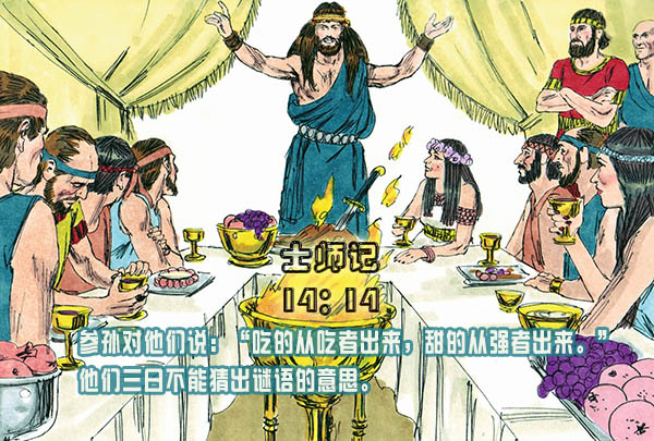 再过些日子,他父亲又为了他的婚事下去见那个亭拿女子,他三番五次去女方家商量这事,我猜是因为双方家庭的习俗差太多,细节谈不拢。非利士人的婚礼肯定要喝酒狂欢,参孙是拿细耳人,应该滴酒不沾,这可怎么办才好呢?谁跟谁妥协呢?男方家庭是拜耶和华的,女方家庭是拜偶像的,两个人在婚礼上要拜谁呢?看来,这个婚礼怎么办,男女双方的家长达不成一致的意见。所以,参孙的父母似乎根本就没参加他的婚礼,只有“参孙在那里摆设筵宴”,如果他的父母在场,也许可以提醒参孙不必故意刁难宾客。参孙做出了所有的让步,放弃了他作为拿细耳人应该守住的规矩,选择按照非利士人结婚的规矩,在女方家办喜事。很可能他的心上人把他说过撕裂狮子的话传给族人了,非利士人对这个女婿又好奇,又害怕,他一到女方家,“就请了三十个人陪伴他。”对参孙的防范做足了。再说了,这么多壮丁来吃喝七天的筵宴,参孙的花费少不了啊!在众人随意吃喝的婚宴上,不一定众人都喜乐,很可能会闹出别扭事的。看来,在参孙的婚宴上,大家不是相谈甚欢,而是唇枪舌剑,说着说着,参孙刁难宾客说,“我给你们出一个谜语,你们在七日之内,若能猜出意思告诉我,我就给你们三十件里衣,三十套衣裳;你们若不能猜出意思告诉我,你们就给我三十件里衣,三十套衣裳。”参孙跟他们要的,不是普通衣裳,是里外配套的,出席正式场合才穿的贵重礼服,大概每个人只有一套。参孙是想靠打赌把办婚礼的花费挣回来吗?他肯定以为自己能赌赢,因为他的谜语不好猜,他给出的谜语是,“吃的从吃者出来,甜的从强者出来。”