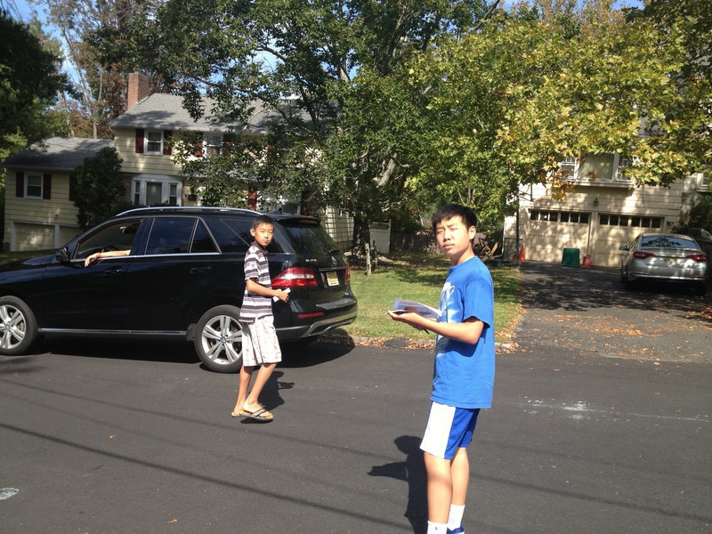 将近一个半小时,走了20家,这个区房子大,间隔远。老公开车开始还一户户跟着,后来看到平均一家4分钟,原计划的开车停每一家不适合,很多还是徒步走。因为豪宅的driveway 长,还真是要把来回走driveway 时间也算上。孩子们不让我跟着,我只能远远地站着。开始两家竖起耳朵听了些,两个孩子声音洪亮,语言流畅。结果是13家拿了flyers, 65% face to face reach。 孩子们把flyers 贴到另7家门上。