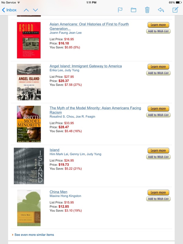 有朋友问起讲华裔美国人的书,想起我们镇妈妈俱乐部2009年曾捐赠学区一批书籍,有的适合小学生,有的适合历史老师和辅导员。近来华人意识到不能缩在自己小圈子里,那么捐书给学区老师,班级和图书馆是一个有长远影响的办法。下面是我做过research, 从Amazon上买的(镇上妈妈捐款)。很多可以买二手书,较便宜,也是新的。