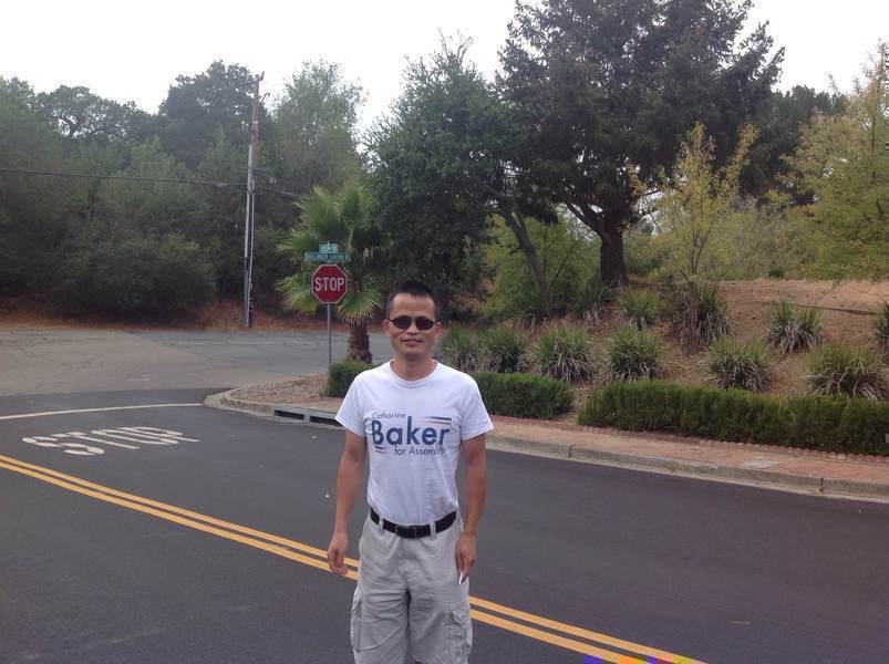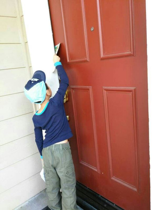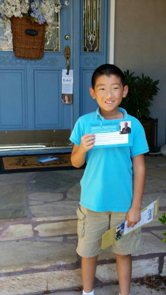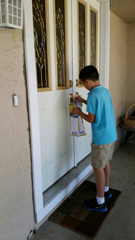 第二次周末扫街时, 我把读小学的儿子拉上, 开始时, 他还有点害怕, 不敢独自去按门铃, 但跟我一起拜访了几家后, 发现屋主们都比较热情, 还挺有趣, 于是他每次都主动飞奔到下一家门口按门铃, 若每人不在家, 就挂上Baker的传单, 也顺便放上George Bowen的传单(Bowen积极反对在Pleasanton建高密度住宅, 正竞选Pleasanton市议员). 有一次, 儿子竟敲开了一位亚裔同学的家门, 两人都惊喜不已, 马上攀谈起来, 我则趁机向大人宣传介绍Baker, 不出所料, 又为Baker敲定两张选票.
