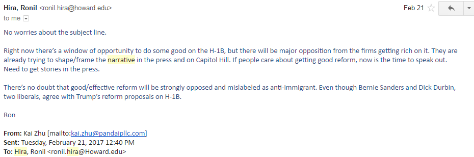 research 后,锁定了两个在这个问题上有媒体曝光的人,一个是一个记者,一个是 Howard University 的印度裔 Public Policy 教授 Ron Hira。我给他们发去 email,都很快得到了回应。然后我和