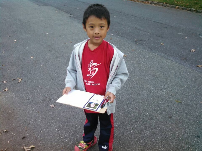 From Ben Zhang: “完成今日扫街任务。准备回家了。1个小时,11家,6家开门聊了一会儿。感觉不错。” 注:家里刚生老三,又做中文学校校长,还带老二扫街,这精神岂止可嘉!