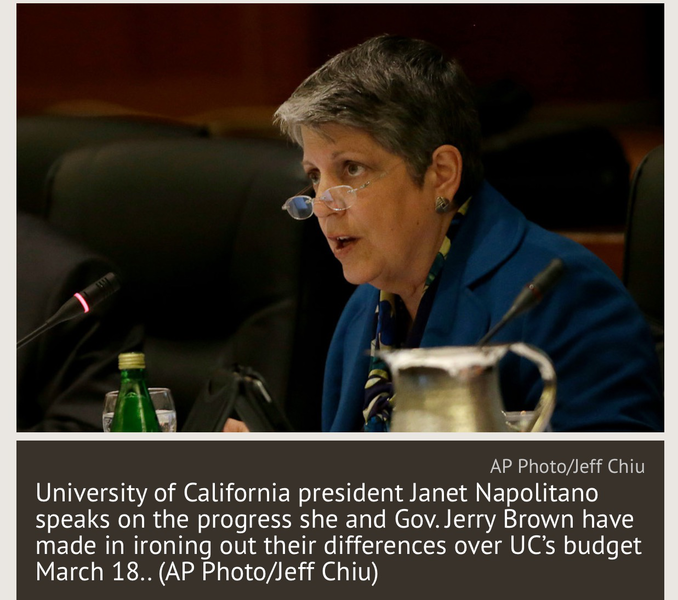 首先出场的是加大主席Napolitano。她老人家可是大名人啊。1999-2003亚利桑那州总检查官,第一个女性任职那个位置,2003-2009亚利桑那州长,2009-2013被欧巴马任命为美国国土安全局长,2013年起是加大校长。福布斯将她列为世界第九大最有影响的女性。2008年纽约时报认为她是最有希望问鼎美国总统的女性。也有人曾经讨论过她可做最高法院大法官人选。她终生未婚也无子女。