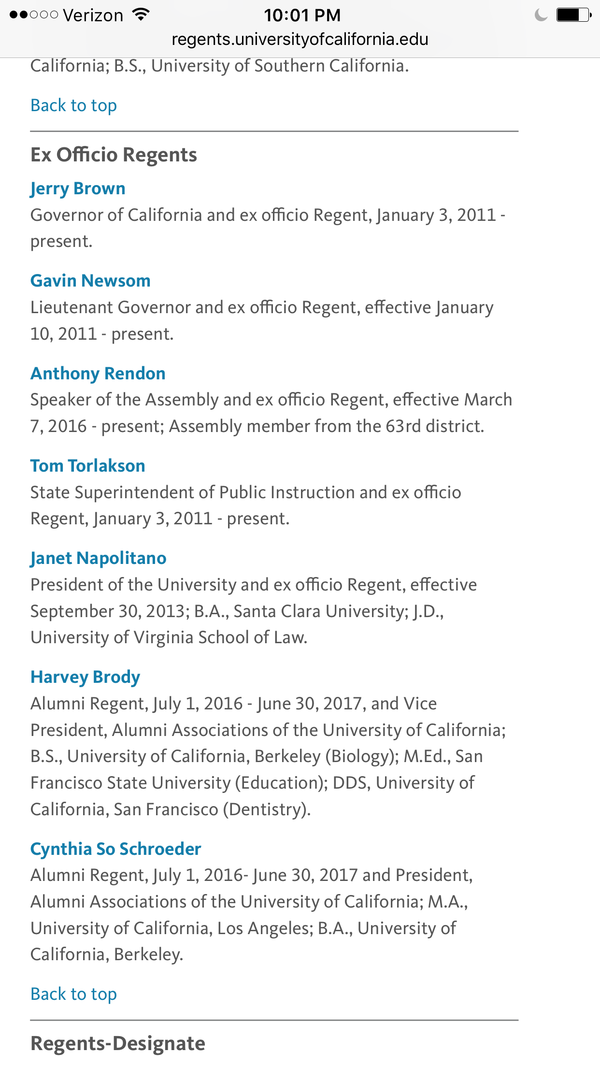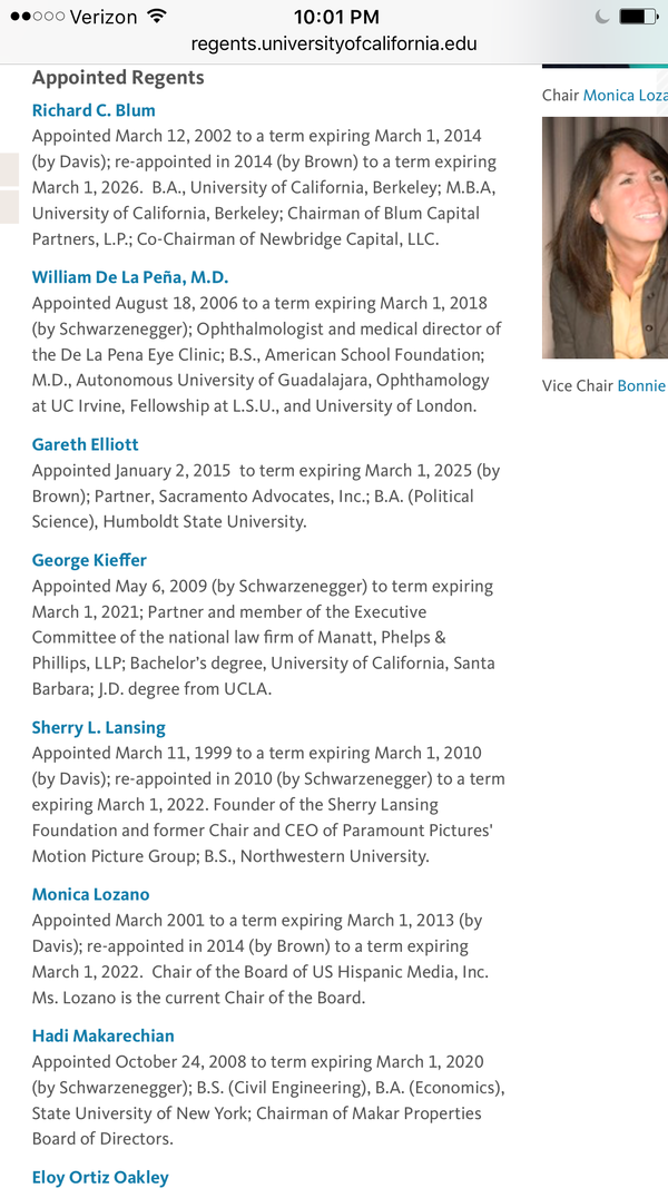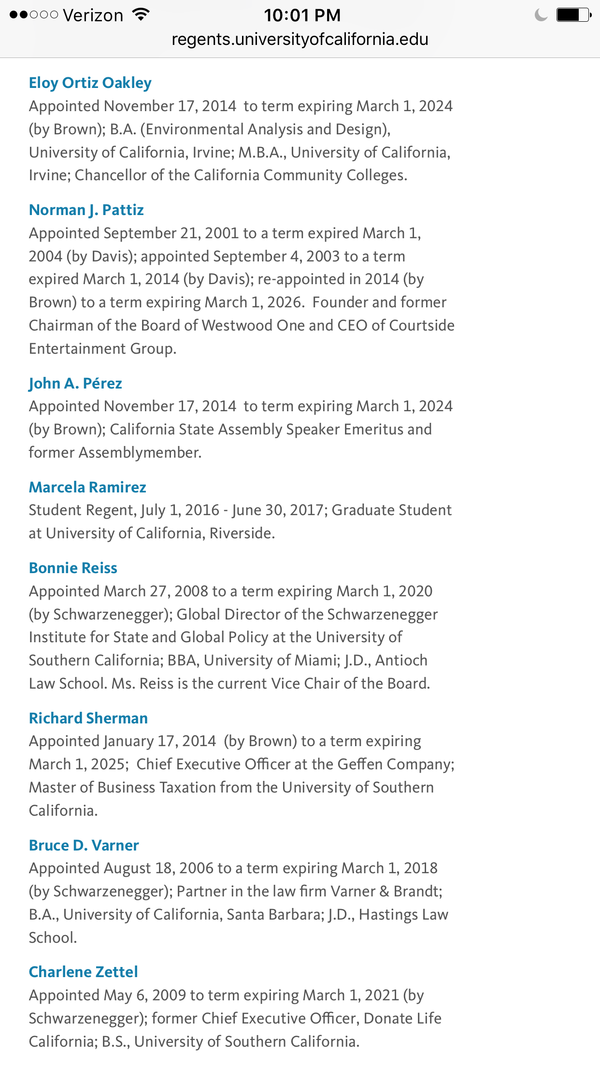 首先,UC是一个独立运营的机构,初衷是为了避免UC被政治控制。由二十六位摄政统管,相当于UC的董事会,而UC的主席则相当于总经理,受他们领导。这二十六人多数是由历届州长任命,任期十二年,另外就是因为职位关系(ex Officio)自动担当的,这些人里有州长Brown,副州长Newsom等等。有趣的是,这些摄政组成了一个共同体,学校的校舍、银行账户等等都归他们共同拥有,交学费写抬头就是给“UC摄政”。另外和一般公司的董事会不同的是,他们个人没有和UC分割,出了啥事儿,要承担个人的法律责任。