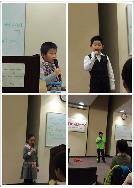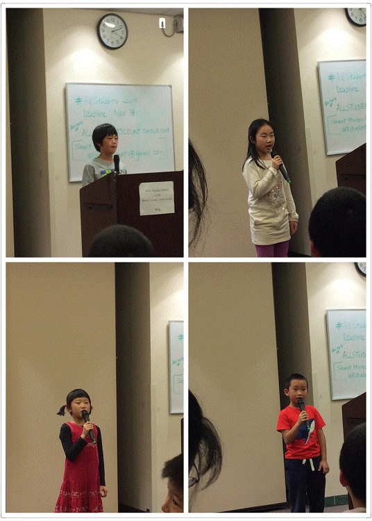 公共演讲,多大开始?孩子越大也许越有了固定模式,家长不好督促了,从年龄小入手是好主意。一些孩子被家长带来,但不想上台;也有勇敢的,临场发挥。能抽出时间赶来已经很不容易了,上台就更精神可嘉。华裔二代太缺乏这方面的锻炼了。家长花大把时间练琴学画甚至体育是好,但更基本的说话技巧影响之深远,大概我们都深有体会吧。家长也许该思考侧重点,而不是等到初中了,一句“我孩子害羞”来解释。如果真害羞,不是更需要培养吗?