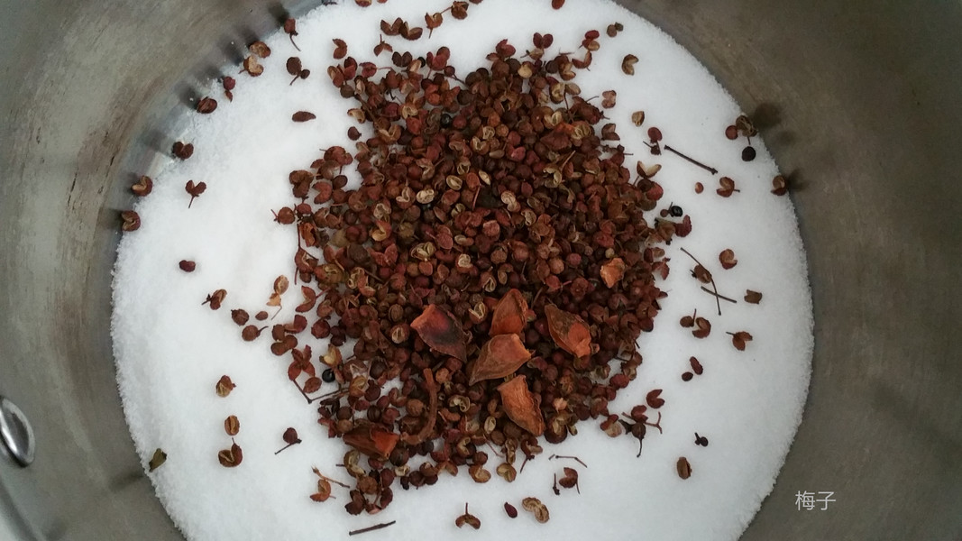 盐和花椒粒,八角放锅里炒出香味。(见下面图示)