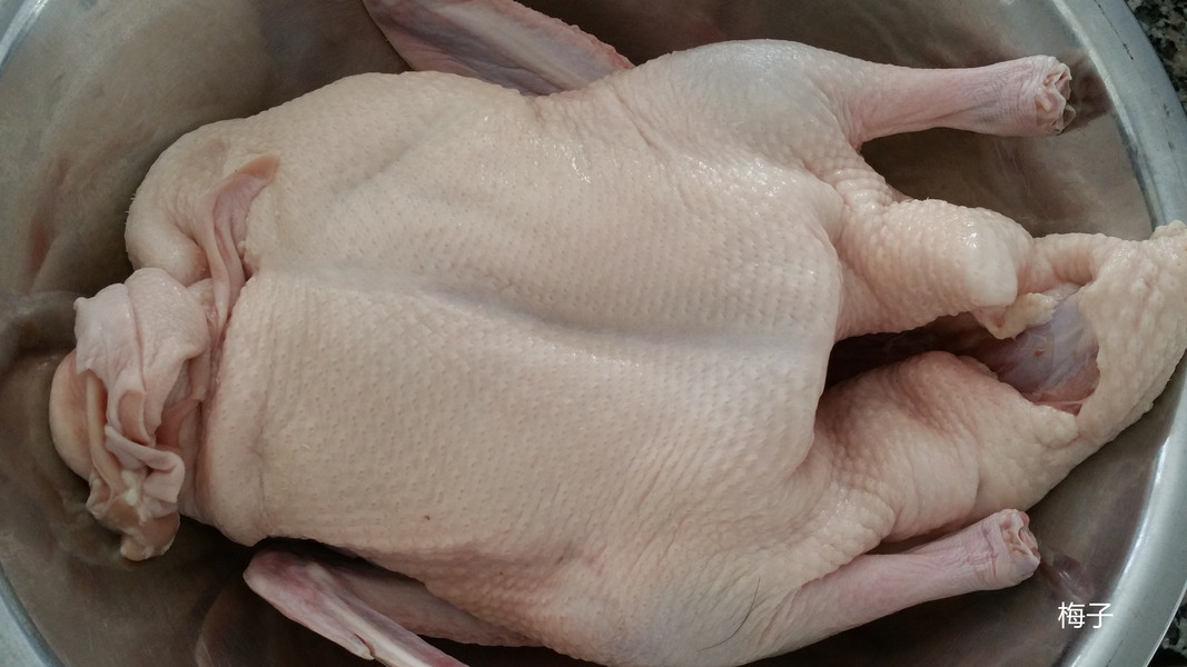 光鸭 五磅,盐适量,花椒一把,八角四个,葱三根,姜一块,料酒适量。