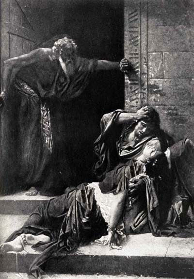 那些围住老人家的歹徒不听老人家的劝,只想和他家的客人利未人“交合”。利未人为了自保,“就把他的妾拉出去交给他们,他们便与她交合,终夜凌辱她,直到天色快亮才放她去。天快亮的时候,妇人回到她主人住宿的房门前,就仆倒在地,直到天亮。” 对于利未人的妾,这是一个多么残酷的夜晚啊!这个被丈夫利未人用“好话”劝说,跟着丈夫回家的女人,在回家的路上,被丈夫拉出去,替丈夫受辱。当她终夜替丈夫受凌辱时,她的丈夫躲在屋里不敢露头;当她受尽耻辱后,她想到的唯一出路,只能是回到丈夫身边,所以她费尽力气,撑着一口气回到丈夫睡觉的家门口,但她没能跨进门,“就仆倒在地”,直到天亮,都没人发现,因为没人惦记着她。她的名字没被交代,她从始至终,也没说过话。
