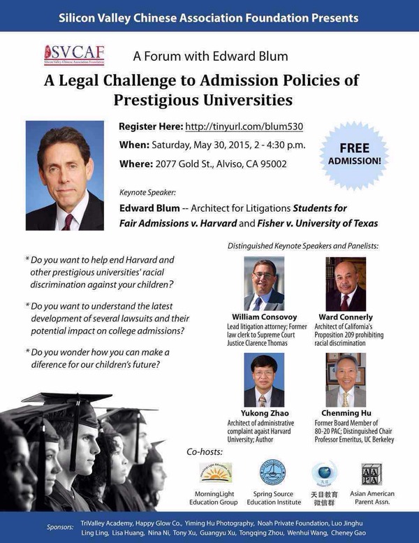 You are cordially invited to a public forum featuring civil activist Edward Blum and attorney Will Consovoy, as well as a slate of renowned experts on equal opportunities for education, including Ward Connerly and Prof. Chenming Hu.