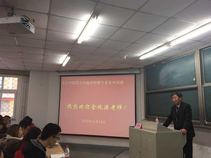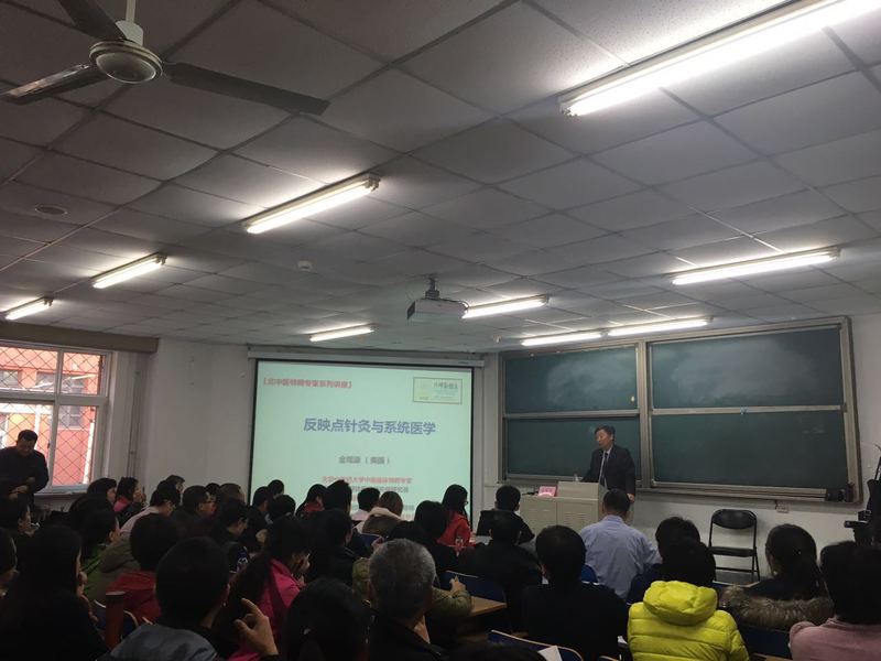 2016年11月14日下午,北京中醫藥大學首批特聘中醫臨床專家,美國金觀源教授在教學樓舉行了以【反映点针灸与系统医学】為題的學術講座,儘管講座時間是在師生們最為忙碌的週一,一間可以容納150人的教室裡依然座無虛席,教室窗外的空間也被不願意挪步的聽眾佔據著。參會的有北中醫的師生,也有外地來校進修的醫生。金教授從孫悟空拜師學藝“非長生不老之術不學”的故事開場,一下子就把全體聽眾的注意力吸引到對针灸真谛的關注上。什么是针灸的真谛?什么是经络学说的精髓?如何使针灸的临床疗效最大化?如何在继承中医经典与千年实践经验的基础上发展现代针灸?一個個對於針灸專業來說都是至關重要的問題都随著金教授精闢而科學的解答而展開,並且步步深入地把大家帶入到現代針灸醫學的殿堂……連續兩個小時的演講加上後續延長近半小時的答疑,始終站在講台邊的金教授一分鐘都沒有休息過。30年前在浙江醫科大學(现浙江大學醫學院)給醫學生上大課時就多次被學生們評選為“最受歡迎的老師”的金教授,再次把他的精彩演講帶到了北中醫的課堂。近二十年前,當金教授首次應北中醫前校長鄭守曾來校訪問時曾給針推系的老師們做個一次演講,時任針推系系主任的谷世吉教授高度評價金教授對發展現代針灸所作的貢獻,讚譽金教授的講座“給北中醫帶來了一縷春風”。那時金教授的兩部巨著【臨床針灸反射學】與【現代醫學針灸】尚未問世。二十年後的今天,金教授首創的“針灸反射學”理論及其指導下的反映點針灸已經歷無數實踐的檢驗。春天的幼苗已經變成參天大樹並且碩果累累,它將再次改變傳統中醫人的思辨理念,加快中醫/針灸現代化的步伐。與會的師生高度評價校領導能夠引進金教授等著名針灸專家來校園授業解惑